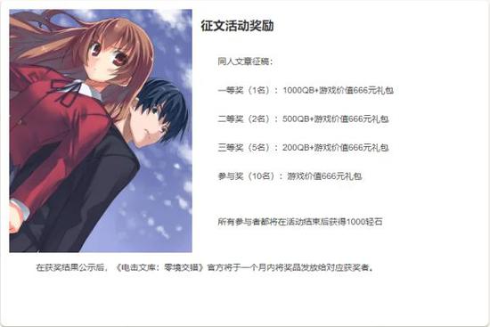 所有参与征文活动的作者都有机会获得海量Q币以及游戏价值666元礼包,征文活动的参与者将在活动结束后获得1000轻石,优秀的作品还有后续开发和合作的机会哦,为自己心中喜欢的角色描绘新的羁绊,他们的故事由你来撰写!