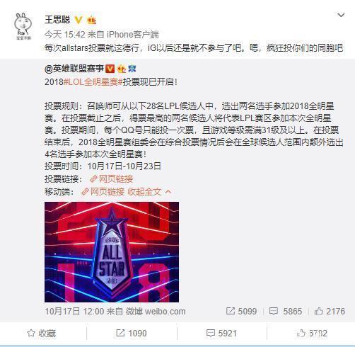2018年《英雄联盟》全明星赛投票于上周开启,将于10月23日也就是今天截止,在投票即将结束之际,王思聪转发了英雄联盟赛事的这条微博,怼了一把投票结果。