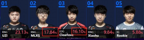 今天就要截止的all stars投票结果基本已经落停,RNG的UZI遥遥领先,得票率高达23.45%,第二名的同样是来自RNG的MLXG,得票率也有17.56%,IG最靠前的Rookie也只排在了第五位,得票率5.80%。