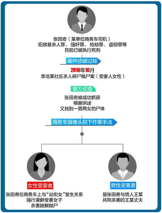侦查人员搜查了张田奇使用的商务车,在车上发现了他安装的摄像头,从中调取了张田奇拍摄的残忍的犯罪过程。通过分析录像,侦查人员发现,在2009年到2010期间,张田奇数次先联系好当地的“站街女”,然后在自己的商务车上与站街女发生关系后,再强行给站街女灌白酒。趁被害人在醉酒状态时,张田奇将被害人杀害,肢解尸体后再将尸块随意处理,范围很广。