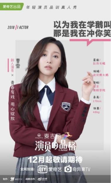 据了解,曹雪因2016年出演管虎导演的《黄皮子坟》中的老羊皮儿媳妇而正式进入演艺圈,并先后出演了《火爆天王》《80℃的爱恋》等作品,此次《演员的品格》也是曹雪首次参加综艺节目,在该节目中,曹雪将和其他选手共同进行百日培训,最终角逐出演爱奇艺定制剧的名额。