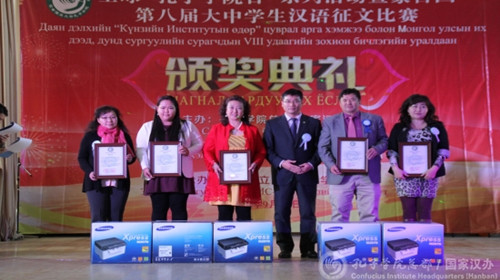 据国家汉办网站消息,日前,蒙古国立大学孔子学院举办庆祝“2015年全球孔子学院日”系列活动暨蒙古国第八届大中学生汉语征文比赛颁奖典礼。中国驻蒙古国大使馆文化参赞李薇、中国驻蒙古国大使馆文化处一等秘书德博、蒙古国立大学孔子学院院长朱军利、蒙方院长其米德策耶、蒙古国汉语教师协会会长巴特玛以及中资企业及旅蒙侨界代表、蒙古国征文比赛获奖个人和单位代表与孔院师生等近300人出席了本次活动。