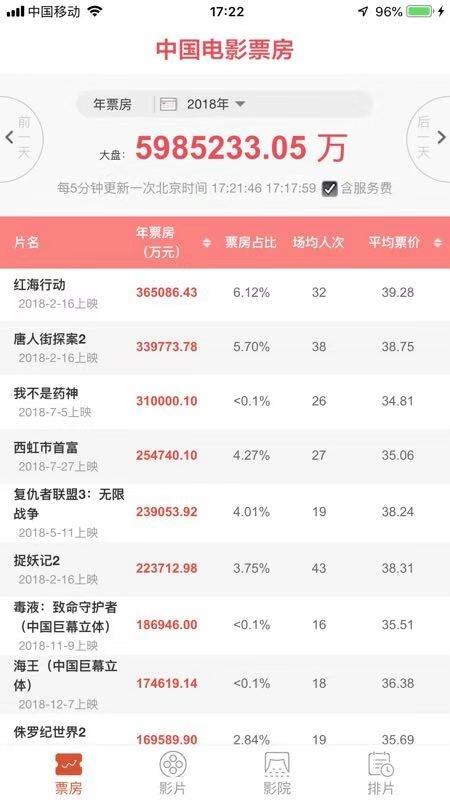 中国电影票房APP数据显示,截至29日17时21分46秒,2018年全国电影总票房已达598.52亿元,距离600亿大关仅“一步之遥”。据证券日报报道,一位传媒行业分析师表示,今年中国电影票房总体表现稳健,根据模型预测,能够达到全年600亿元的票房预期。