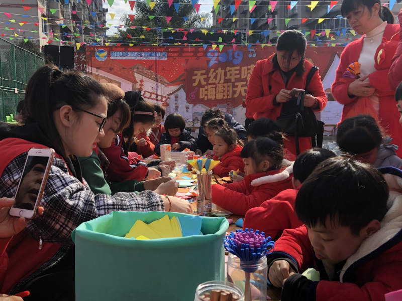 为了让烘托节日氛围,教师们对班级室内、室外环境进行了布置,整个幼儿园处处都蕴含着浓郁的新年气氛。各班开展了亲子游戏、打击乐表演、舞蹈表演、亲子制作等活动,以不同形式迎接新年的到来。红领巾们为孩子们准备了纸和剪刀,在红领巾和家长的带领下小朋友们剪出了五颜六色的diy手工作品。孩子们一手拿着剪刀,一手拿着纸,时而认真思考,时而上下摆动。孩子们个个神情专注,宛如一个个小剪纸艺术家。十几分钟,一张张彩纸在他们的手中变成了各种各样的图形。