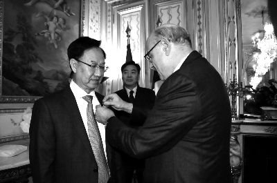 中国驻法国大使翟隽、中国常驻联合国教科文组织大使衔代表张秀琴、中国驻法国使馆文化处公参李少平、巴黎六区区长乐高克、巴黎十三区区长顾梅、巴黎市议员陈文雄等嘉宾出席授勋仪式。(尚栩)