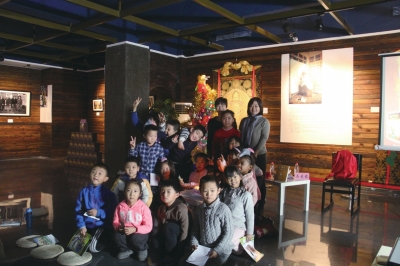 “红城王国”圣诞故事会结束后,翻译家马爱农(后排右一)与小朋友们合影。