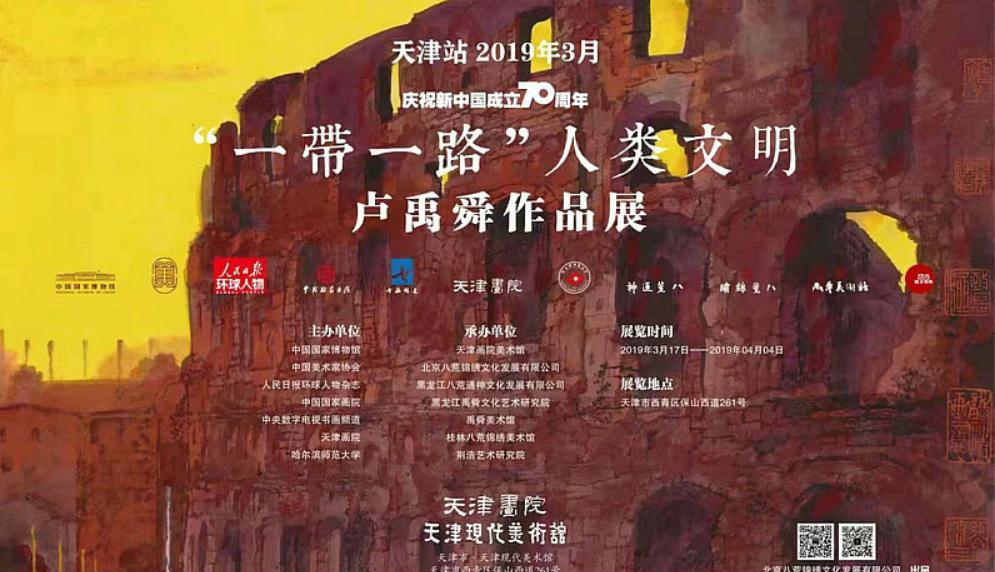 由中国国家博物馆、中国美术家协会、人民日报环球人物杂志、中国国家画院、中央数字电视书画频道、天津画院、哈尔滨师范大学主办,天津现代美术馆、北京八荒锦绣文化发展有限公司、黑龙江八荒通神文化发展有限公司、黑龙江禹舜文化艺术研究院、禹舜美术馆、桂林八荒锦绣美术馆、荆浩艺术研究院承办的“庆祝新中国成立70周年——‘一带一路’人类文明卢禹舜作品展”将于3月17日下午2点30分在天津现代美术馆(天津市西青区保山西道261号)开幕。