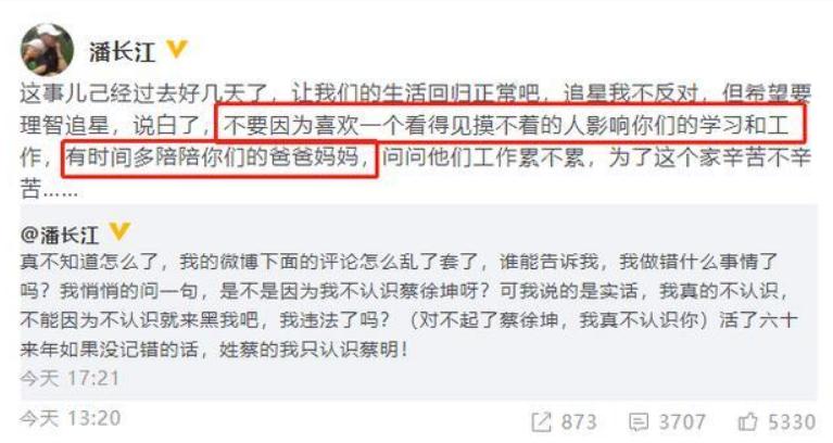 2019年3月16日下午,潘长江再度发文回应“不认识蔡徐坤”事件!他表示:“这事儿己经过去好几天了,让我们的生活回归正常吧,追星我不反对,但希望要理智追星,说白了,不要因为喜欢一个看得见摸不着的人影响你们的学习和工作,有时间多陪陪你们的爸爸妈妈,问问他们工作累不累,为了这个家辛苦不辛苦……”