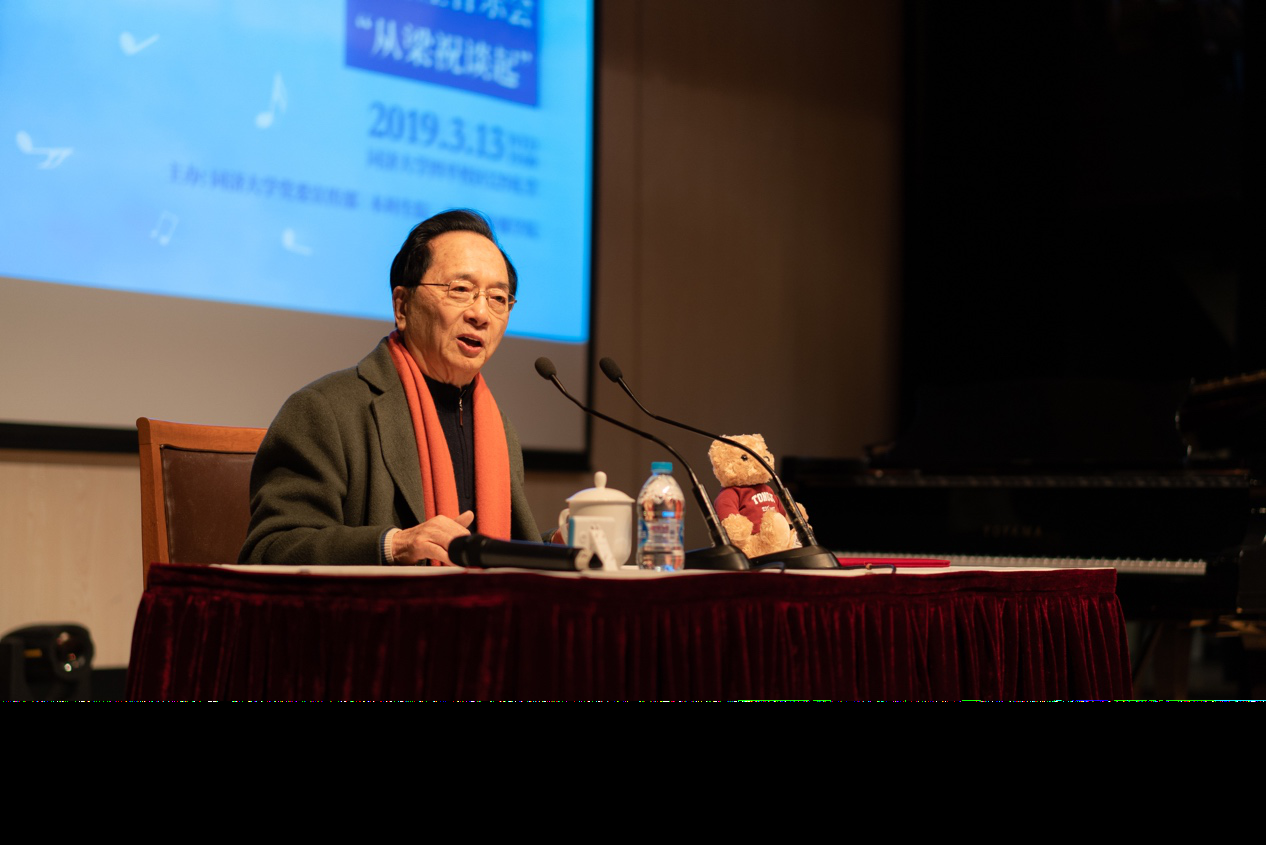 讲座上,陈钢从梁祝谈起,介绍了自己几十年来对音乐的经验和理解。音乐对于陈钢来说,不仅仅是一种感官上的享受,而是一种能上升到传统、文化和情感的艺术载体。正如《梁祝》,以越剧为基础,在一个“mi-so-la-do”的基本元素上,从编曲上发挥了梁山伯祝英台爱情悲剧的婉转千回的特点,又在节奏上融合西方交响乐的爆发力,交融了中西方音乐的特色,体现了海派文化的特质以及中华文化的包容,具有超前而独特的艺术魅力,成为中国音乐的一张名片。谈至酣处,陈钢即兴为同学们弹奏了一曲《梁祝》片段。提起小提琴,陈钢深情地说:“小提琴为什么叫红色小提琴?因为这红色是花样年华中的一抹朝霞,是蹉跎岁月里的血色浪漫。”讲起自己参与革命事业的过往,他又激情澎湃:“作曲家要在没有阳光的时候写出阳光,在没有早晨的时候写出早晨,在没有希望的时候写出希望!”谈到自己已至耄耋之年依然显得年轻活力的秘诀:“音乐让人不老。之所以如此,是因为它永远给人们阳光、早晨与希望!”