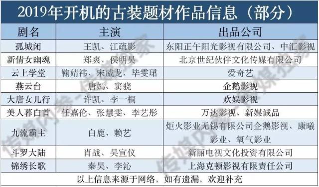 与此同时,根据2019年新剧开机的古装题材作品信息来看,作为此类剧集播出重地的视频网站更加偏爱此类题材,自制或联合出品的剧目占了三分之一。另外,拥有众多经验与实力的老牌影视公司在古装“遇冷”下也没有“放弃”该类作品,纷纷进行战略布局,例如正午阳光、新丽影视、上海克顿等等。
