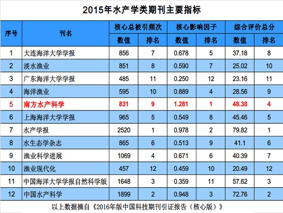 10月12日,中国科学技术信息研究所发布了《2016年版中国科技期刊引证报告(核心版)》数据。由中国水产科学研究院南海水产研究所主办的《南方水产科学》,2015年影响因子为1.281,比2015年版(0.894)增长了43.3%,名次上升2位,再次位居水产学类期刊第1位。