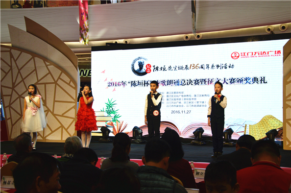 据了解,本次征文比赛分为小学组、中学组、群众组三个组别分别设一、二、三等奖。经专业评选,《我的油纸伞》、《中华少年》两个节目获得小学组一等奖,《妈妈,送你半朵玫瑰花》节目获得中学组一等奖。《江门大道》节目获得群众组一等奖。当天还为 “陈垣杯”征文比赛一等奖的获奖者颁发证书。来自丰乐小学伍芳宜的作品《永不言败走向成功》等6个作品获得一等奖。