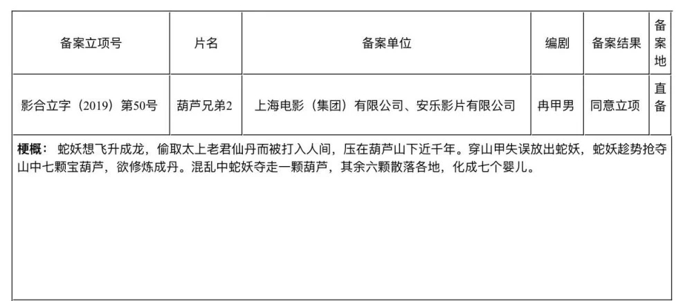 8月1日,据国家电影局备案、立项公示显示,《葫芦兄弟2》正式立项,备案单位是上海电影集团有限公司及安乐影片有限公司,由著名编剧冉平的女儿冉甲男(曾编剧过《画皮2》)担任编剧。新京报记者独家联系到上影集团确认了这个消息。