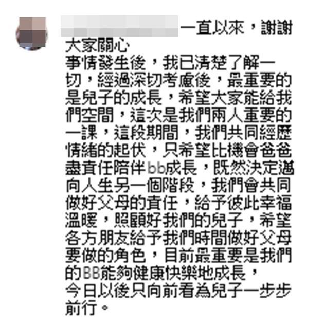 一直没有开腔的雯雯在社交网贴了一张日出照,似寓意一切重新开始,并发文回应这件事,称只会向前看并放下Steven过去的桃色纠纷,专注儿子的成长:“一直以来,谢谢大家关心!事情发生后,我已清楚了解一切,经过深切考虑后,最重要的是儿子的成长,希望大家能给我们空间,这次是我们两人重要的一课,这段期间,我们共同经历情绪的起伏,只希望给机会爸爸尽责任陪伴BB成长,既然决定迈向人生另一个阶段,我们会共同做好父母的责任,给予彼此幸福温暖,照顾好我们的儿子,希望各方朋友给予我们时间做好父母要做的角色,目前最重要是我们的BB能够健康快乐地成长,今日以后只向前看为儿子一步步前行。”