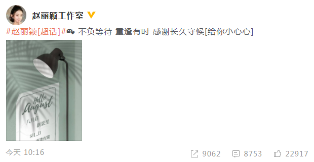 8月1日,赵丽颖工作室晒出一张图片,并配文:“不负等待,重逢有时,感谢长久守候”,图片中写着,“八月启,新景至,8月---日,重逢有期。”