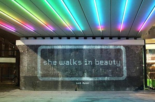 最终,擅长做灯光艺术装置的本地艺术家 Jo Fairfax 从政府举办的方案设计竞赛中脱颖而出,成为了该计划的执行者。Jo Fairfax 提出了 Line of Light 的方案,他主张在天桥下方的桥洞内,用灯光投影在墙上显出优美的诗句,当天桥上方的火车驶过时,桥洞内的霓虹灯以及诗句都会随之变化。