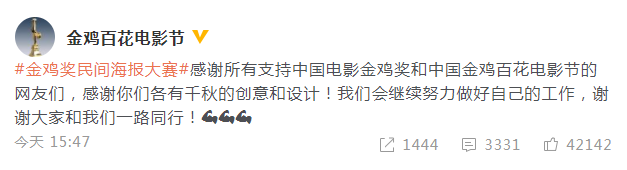 8月13日,金鸡奖官方微博回应此前网友自发组织的“金鸡奖民间海报大赛”,称:“感谢所有支持中国电影金鸡奖和中国金鸡百花电影节的网友们,感谢你们各有千秋的创意和设计!我们会继续努力做好自己的工作,谢谢大家和我们一路同行!”