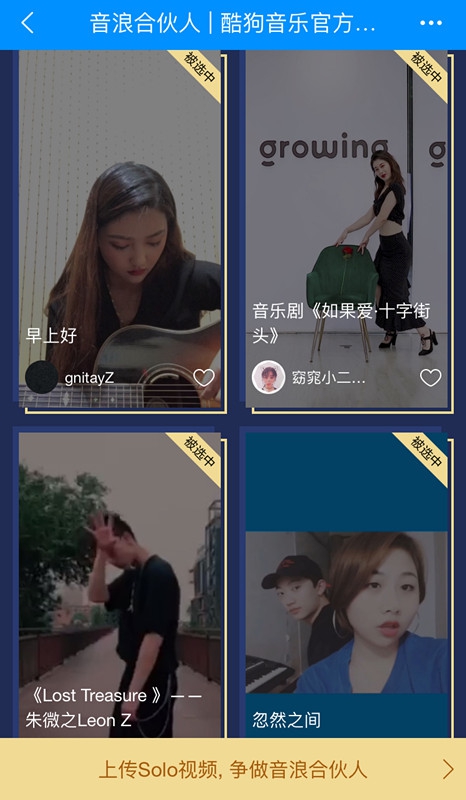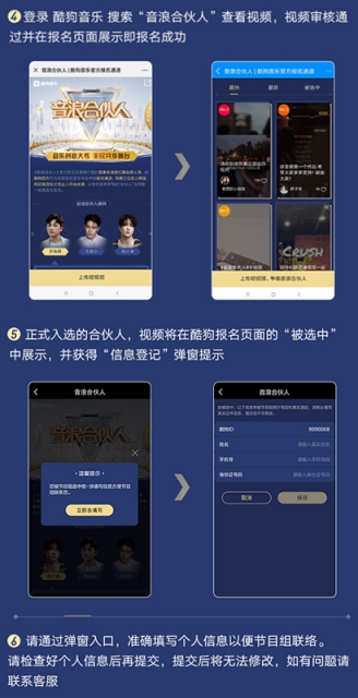 然后,登录酷狗音乐APP,搜索“音浪合伙人”查看视频,视频审核通过并在报名页面展示即报名成功!正式入选的合伙人,视频将在酷狗报名页的“被选中”中展示,并获得“信息登记”弹窗提示!只要根据弹窗入口提交个人信息,之后就坐等节目组联系了~