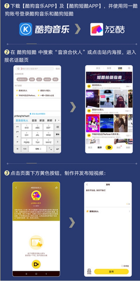 报名方式很简单。下载酷狗音乐APP和酷狗短酷APP,并使用同一账号登录,随后在酷狗短酷APP中搜索“音浪合伙人”,或点击站内海报进入报名话题页,制作并发布短视频即可。