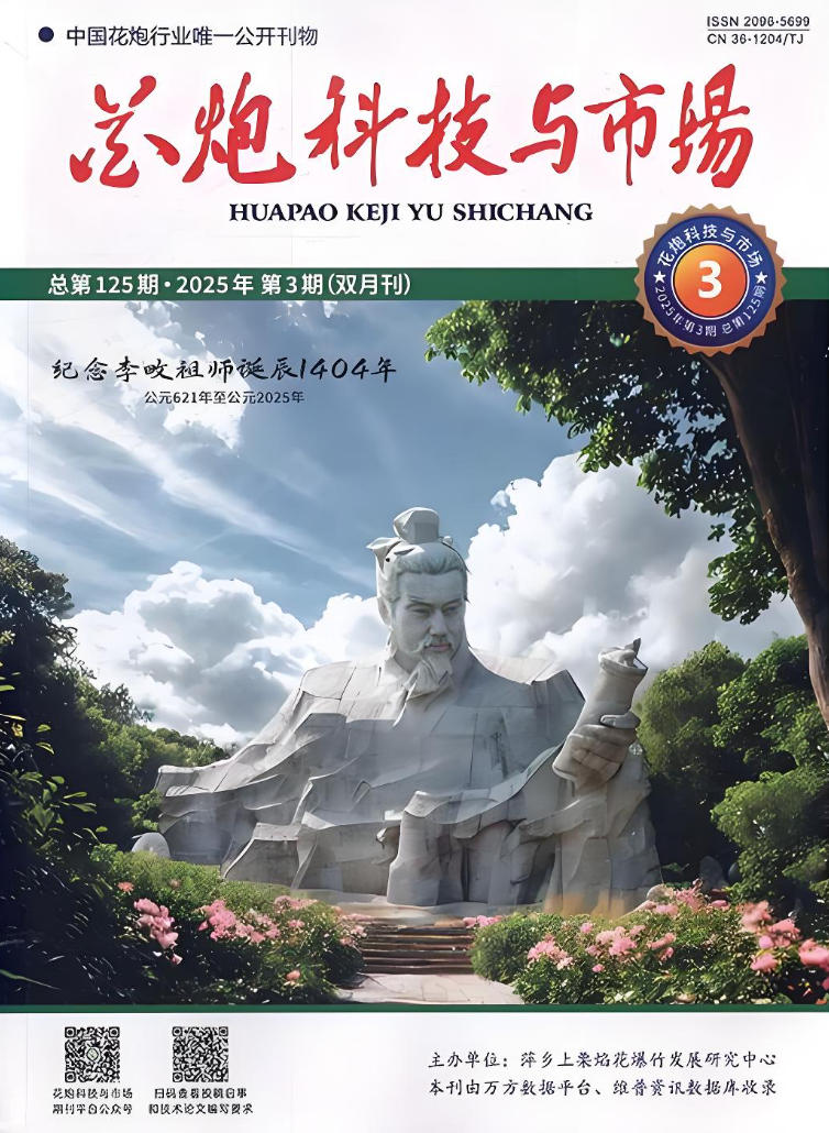 《花炮科技与市场》杂志由农业部烟花爆竹质量监督检验测试中心、萍乡市焰花鞭炮科学研究所主办,国内统一刊号:36-1204/TJ,国际标准刊号:2096-5699,季刊,面向国内外公开发行。