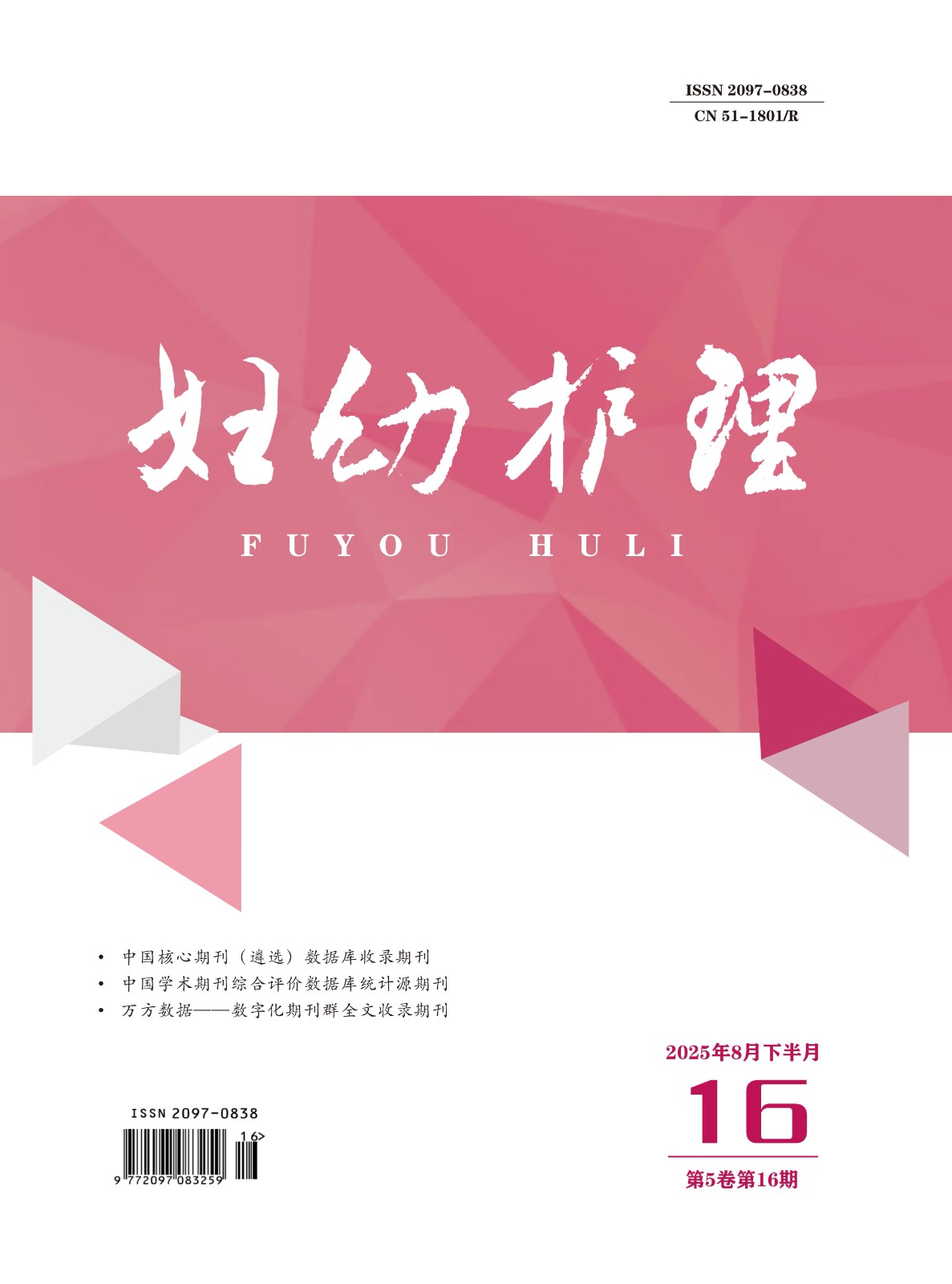 《妇幼护理》杂志是经国家新闻出版广电总局批准,由四川日报报业集团主管、主办的全国公开发行的医药卫生类学术期刊。国内统一刊号:51-1801/R,国际刊号:2097-0838,万方收录,半月刊。
