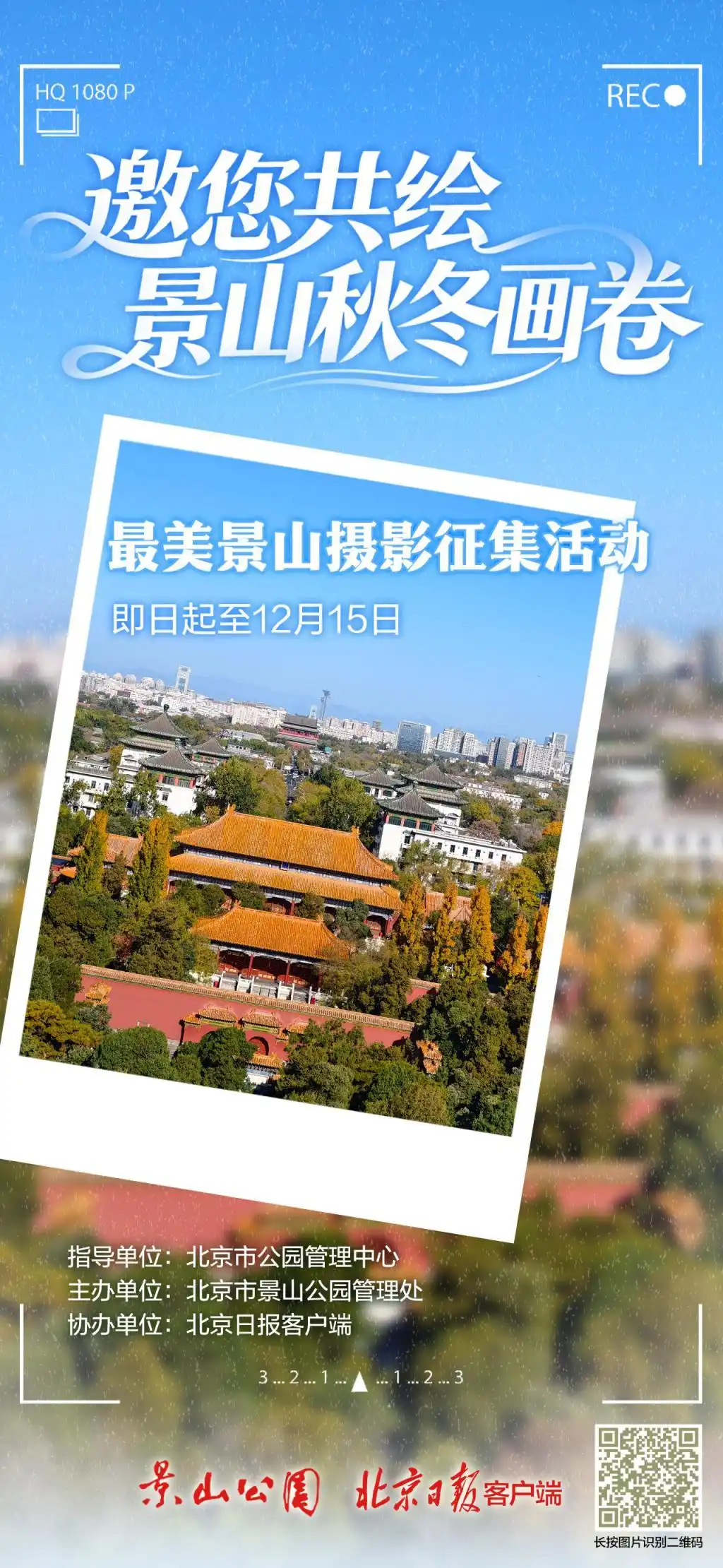 为体现活动的公益性,注重摄影作品本身的社会价值和意义,增强作品的展示和传播,本次活动共征集50幅优秀作品,入围者将获得精美文创礼品一份,入围作品用于公益宣传,如展览、媒体推广等。主办方依据网友投票,选取出点赞总数前50名作品。每人每天最多投5票,严禁作弊、刷票等违规行为,违规者将被取消参评资格。同一投稿人不重复发奖,2025年12月30日将在北京日报客户端、景山公园官方微博、微信公众号同步公布获奖名单。