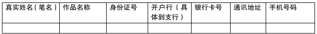 真实姓名(笔名)、作品名称、身份证号、开户行(具体到支行)、银行卡号、通讯地址、手机号码。