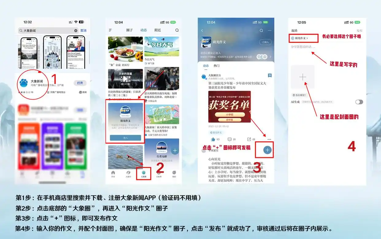 请家长在手机应用商店搜索并下载、注册“大象新闻”APP,将作文在大象圈—“阳光作文”圈子发布(点击此处即可进入圈子),点击页面上的“+”图标即可发布作文(须提前准备一张封面图片),文末务必注明:组别(小学或初中)、作者姓名、学校、指导老师(没有指导老师的可空缺)。